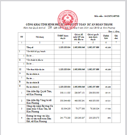Về việc công khai số liệu phê duyệt quyết toán dự án hoàn thành các công trình năm 2023, xã Kim Phượng